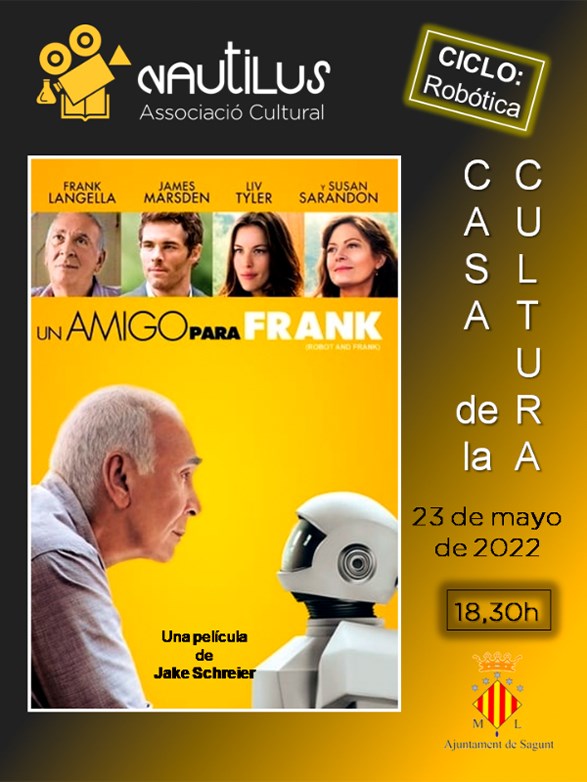 Esta vesprada a les 18.30 hores en col·laboració amb la regidoria de Cultura de l'Ajuntament de Sagunt, l'Associació Cultural Nautilus inicia un cicle de cinema dedicat a la robòtica i a la intel·ligència artificial que serà presentat per Vicky González. La primera de les tres pel·lícules que oferirà este cicle és l'americana, Un amigo para Frank (2012), dirigida per Jake Schreier.