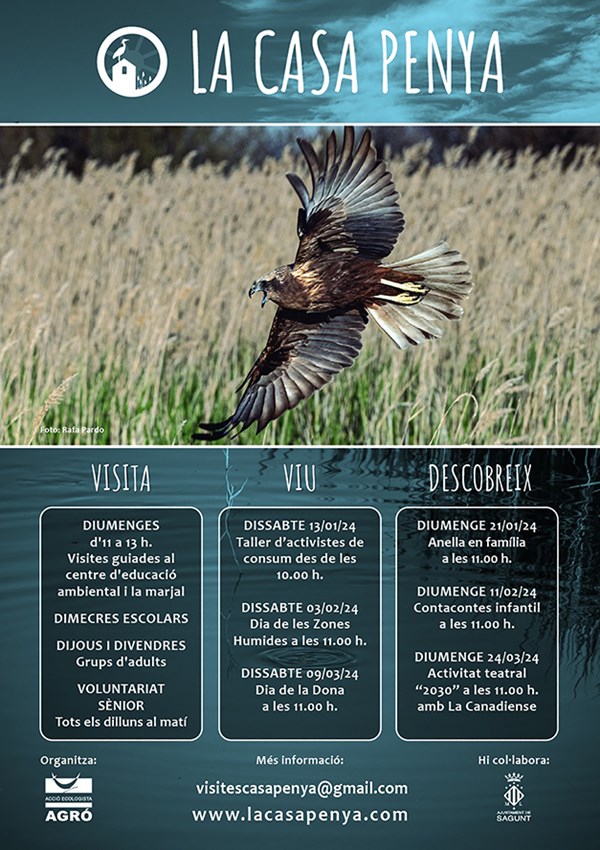 Els efectes de la crisi climàtica i de la sobreexplotació dels aqüífers posen en perill el bon estat de conservació de la marjal d'Almenara. Educar i conscienciar la ciutadania en les bones pràctiques i la necessitat de participar activament en la protecció dels aiguamolls és el repte de la programació hivernal de La Casa Penya.
