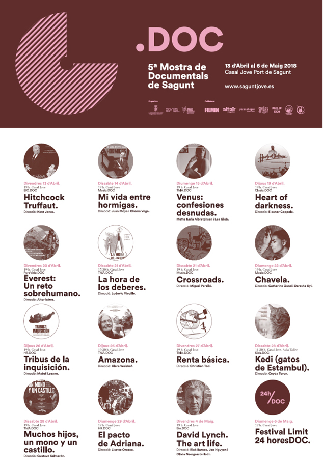 Hitchcock/Truffaut, Mi vida entre las hormigas, Venus: Confesiones desnudas, Heart of Darkness, Everest: un reto sobrehumano, La hora de los deberes, Crossroads, Chavela, Tribus de la Inquisición, Amazona, Renta Básica, Kedi (Gatos de Estambul), Muchos hijos, un mono y un castillo, El pacto de Adriana y David Lynch: The art of life, són les estupendes quinze obres que ompliran la programació d'enguany, un gran escombratge de l'actualitat, la creació artística, la denúncia, la reflexió i el compromís social. De nou, a través del festival, es porten a Sagunt els millors treballs nacionals i internacionals en este gènere, incloent els dos últims guanyadors del premi Goya.