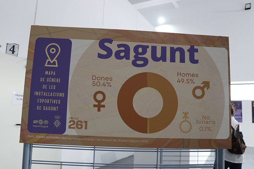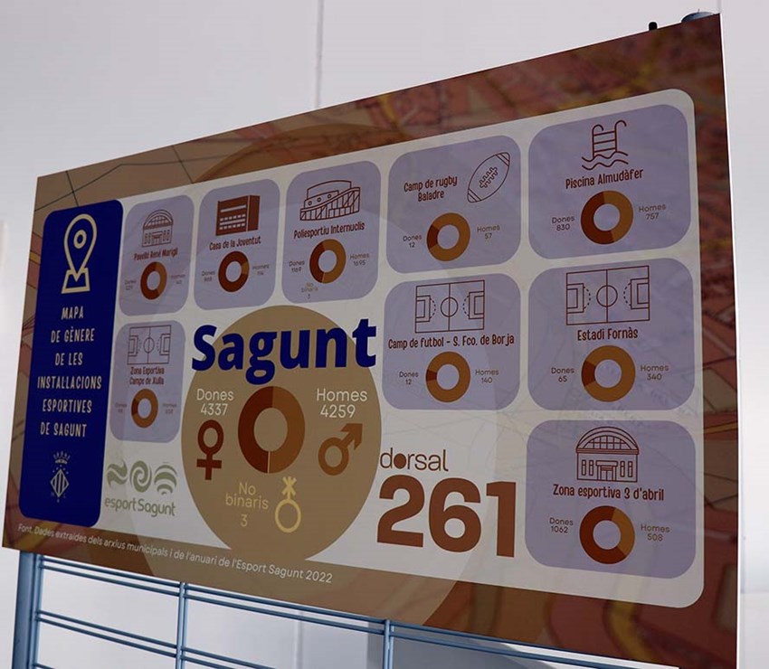 D'altra banda, com a segona acció d'este programa s'ha exposat uns mapes de gènere sobre instal·lacions esportives de la ciutat de Sagunt. Estos mapes recullen el percentatge d'hòmens, dones i persones no binàries que estan inscrits en les activitats que es realitzen en les instal·lacions municipals. Esta informació es pot veure en un mapa general que mostra la totalitat de les dades de les instal·lacions, i en mapes amb la informació separada per cadascun dels recintes municipals.