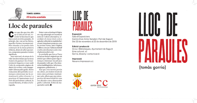 Amb esta mostra, el dissenyador gràfic Tomás Gorria tracta de donar vida a les paraules alhora que fa un repàs per la seua carrera professional. Per a això, utilitza l'humor, juga amb els vocables, les grafies, els logos, les tipografies i la imaginària popular. Tal com ell explica, el títol ‘Lloc de paraules’ ve de «lloc en tant ubicació i en tant so que remet al joc». Gorria utilitza el seu enginy per a retorçar les paraules i extraure el seu suc, donant com a resultat el seu propi significat peculiar i creatiu de cada paraula.