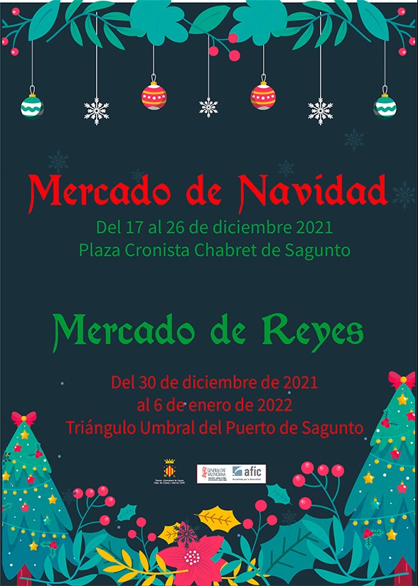 “Mercat de Nadal” emplaçat en la Plaça Cronista Chabret de Sagunt des del 17 al 26 de desembre. La inauguració tindrà lloc hui, 17 de desembre, a les 18 hores. A més dels llocs amb productes d'alimentació, artesania, etc. hi haurà animació per a xiquets i xiquetes amb activitats com a capgrossos, contacontes, jocs infantils amb monitors, nadales i ambient musical, i música en directe amb grups locals.