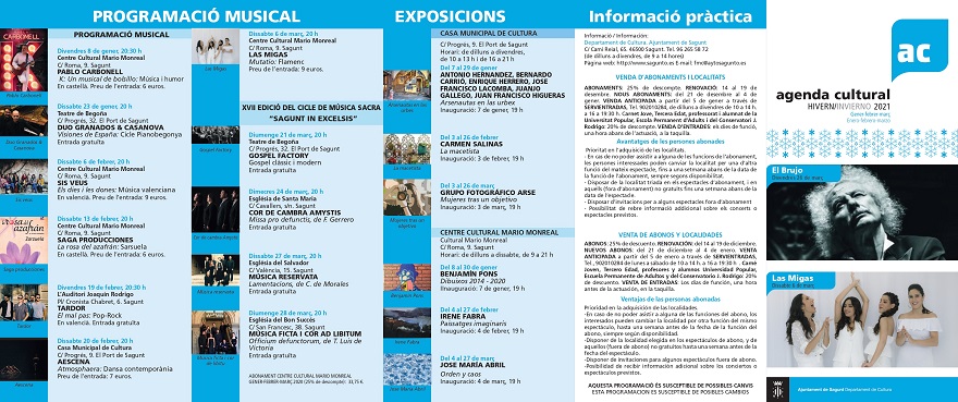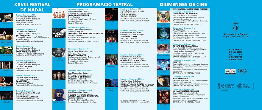 La Delegació de Cultura de l'Ajuntament de Sagunt ha presentat hui la programació d'hivern. El mes vinent de gener donarà principi l'agenda cultural entre la qual destaca el XXVIII Festival de Nadal i el Cicle de música sacra ‘Sagunt in excelsis’.