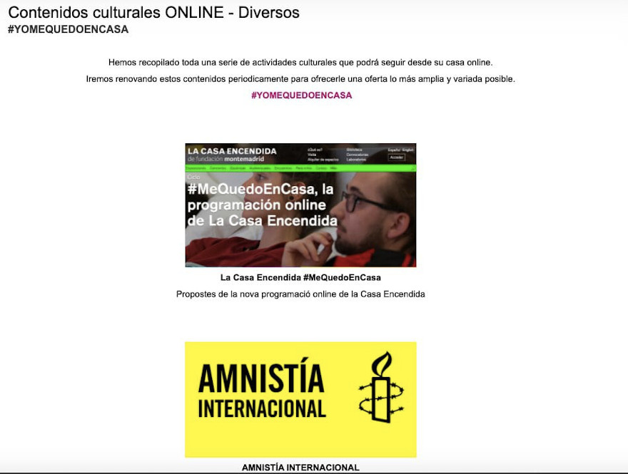 Finalment, en la secció de Diversos les persones podran fer ús de programació de ‘La casa encendida”, que inclou en els seus continguts de música de Spotify, conferències en canal de Youtube, material pedagògic o un club de lectura en Facebook, entre altres propostes que es desenvolupen en este espai cultural. D'altra banda, en esta secció també es redirigix cap al lloc web d'Amnistia Internacional, que ha posat en marxa activitats per a realitzar o veure amb xiquets i xiquetes i adolescents. Algunes de les activitats són contes i jocs de taula, entre altres.
