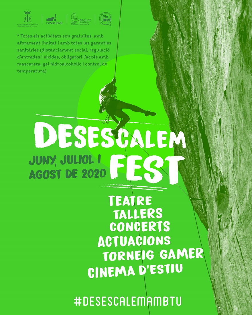 Desescalem Fest per als mesos de juny, juliol i agost. Este conjunt d'activitats oferix una combinació de cinema d'estiu, concerts de música rock, monòlegs i humor, teatre, tallers i altres activitats més, com astronomia, joc de fuita i la Setmana Gamer. Les activitats seran gratuïtes, amb aforament limitat i amb totes les garanties sanitàries (distància social, regulació d'entrades i eixides, màscara obligatòria, ús de gel i control de temperatura). Així mateix, ja que l'aforament és limitat, la regidoria ha facilitat el següent enllaç
