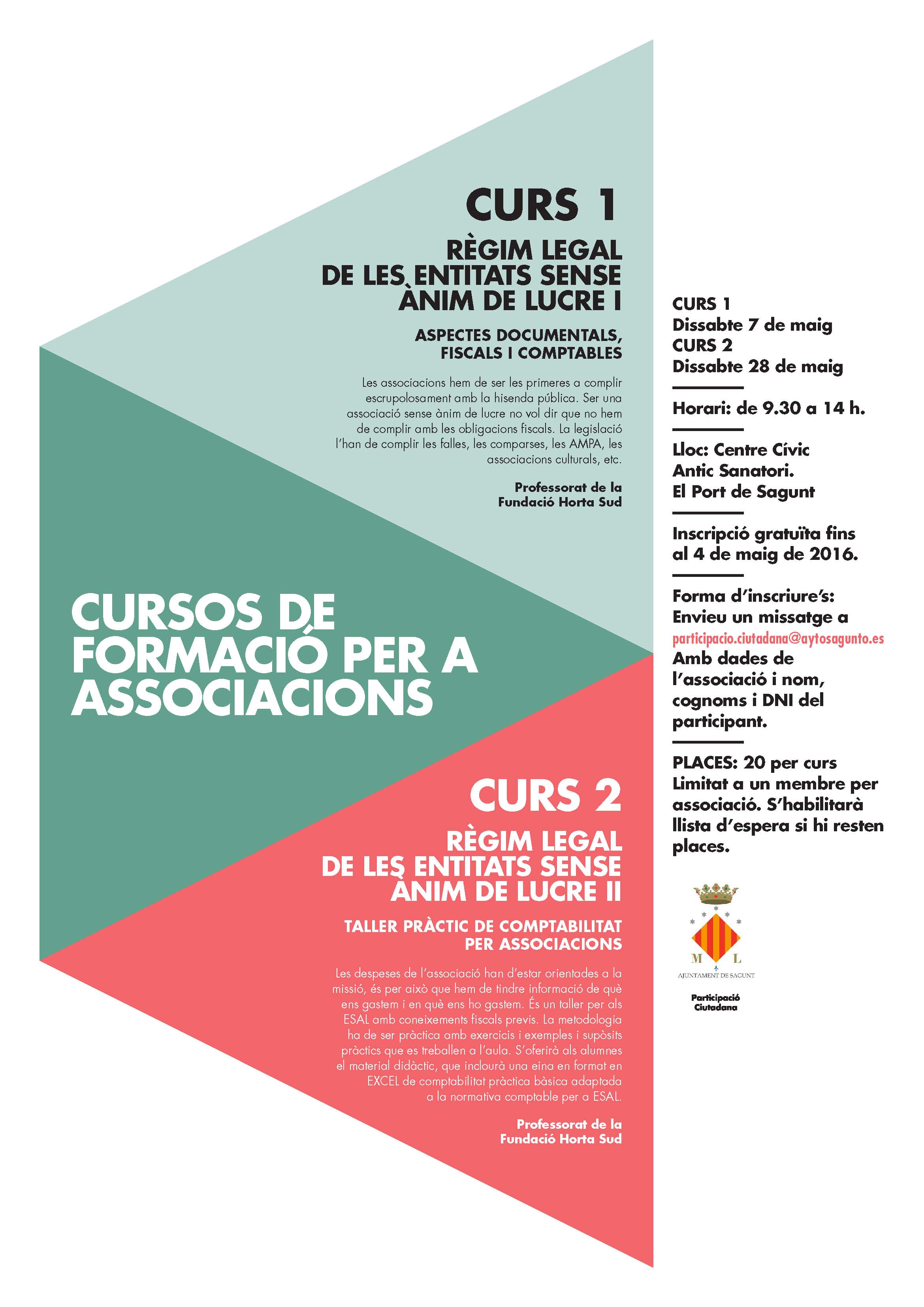El primer curs s'impartirà el dissabte, 7 de maig, i el segon el dissabte, 28 de maig. L'horari serà de 9.30 a 14 hores en el Centre Cívic Antic Sanatori del Port de Sagunt. Aquells que desitgen inscriure's podran fer-ho enviant un correu electrònic a participacio.ciutadana@aytosagunto.es amb les dades de l'associació, el nom, cognoms i DNI del participant. Hi ha disponibles vint places per curs, limitades a un membre per associació, i s'habilitarà llista d'espera per si sobren places. La formació la impartirà la Fundació Horta Sud.