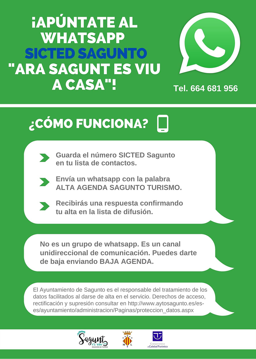 A més, es recorda que este és un servici unidireccional, és a dir només per a rebre informació d'esta iniciativa i no per a resoldre dubtes. Turisme té habilitats els telèfons 96 265 58 59 i 96 269 04 02 de les oficines de turisme de Sagunt i del Port de Sagunt respectivament, els correus electrònics sagunto@touristinfo.net, tur.sagunto@aytosagunto.es, saguntoplaya@touristinfo.net i tur.puerto@aytosagunto.es, el perfil Sagunt Turisme en xarxes socials i el blog