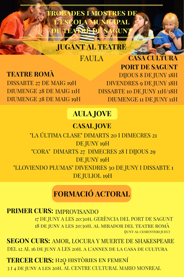 Per la seua banda, els tres cursos de Formació Actoral representaran els seus treballs anuals en tres jornades. Serà del dilluns 12 al divendres 16 de juny quan l'alumnat del segon curs represente Amor, locura y muerte de Shakespeare en l'annex de la Casa de Cultura. Per a esta obra serà imprescindible apuntar-se ja que l'aforament serà limitat. Finalment, el grup del primer curs representarà Improvisando en dos llocs emblemàtics de la ciutat, el dissabte 17 de juny, a les 20.30 hores, en la Gerència del Port de Sagunt i el diumenge 18 de juny, a les 20.30 hores, en el mirador del Teatre Romà (junt al cementeri jueu).