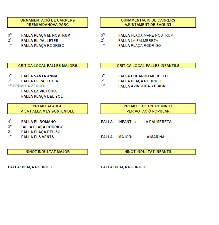 La comissió de la falla Plaça Rodrigo també pot celebrar el premi de millor ninot indultat major; a més, esta mateixa comissió també s'ha alçat amb el millor ninot indultat infantil. La millor ornamentació de carrers ha recaigut en la falla Plaça Rodrigo, que ha quedat per davant de la Palmereta (segona) i de Plaça Mare Nostrum (tercera).
