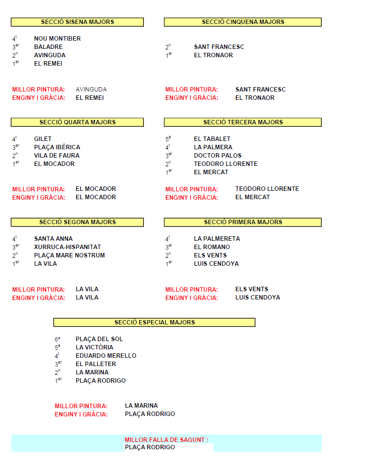 El jurat ha atorgat a la falla Plaça Rodrigo el primer premi en la Secció Especial, a més del d'Enginy i Gràcia. El segon premi en la categoria gran ha sigut per a la Marina, que també ha obtingut el premi de Millor Pintura, mentre que El Palleter ha quedat en tercer lloc. El quart, cinqué i sisé premi han sigut per a les falles Eduardo Merello, La Victòria i Plaça del Sol respectivament.