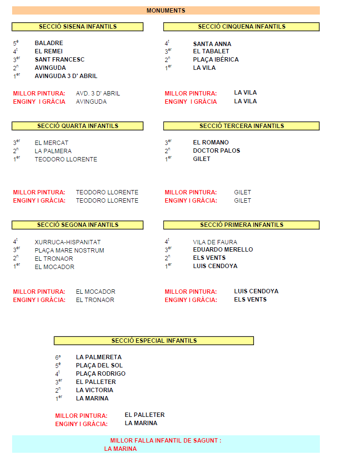 Quant a la categoria infantil, la falla guanyadora d'enguany és La Marina, que també ha rebut el premi d'Enginy i Gràcia. El segon premi de Secció Especial ha sigut per a la falla La Victòria. D'altra banda, el tercer premi l'ha aconseguit El Palleter, així com el de Millor Pintura; el quart premi Plaça Rodrigo i el cinqué i sisé premi han sigut per a la Falla Plaça del Sol i La Palmereta respectivament.