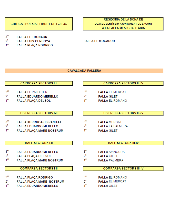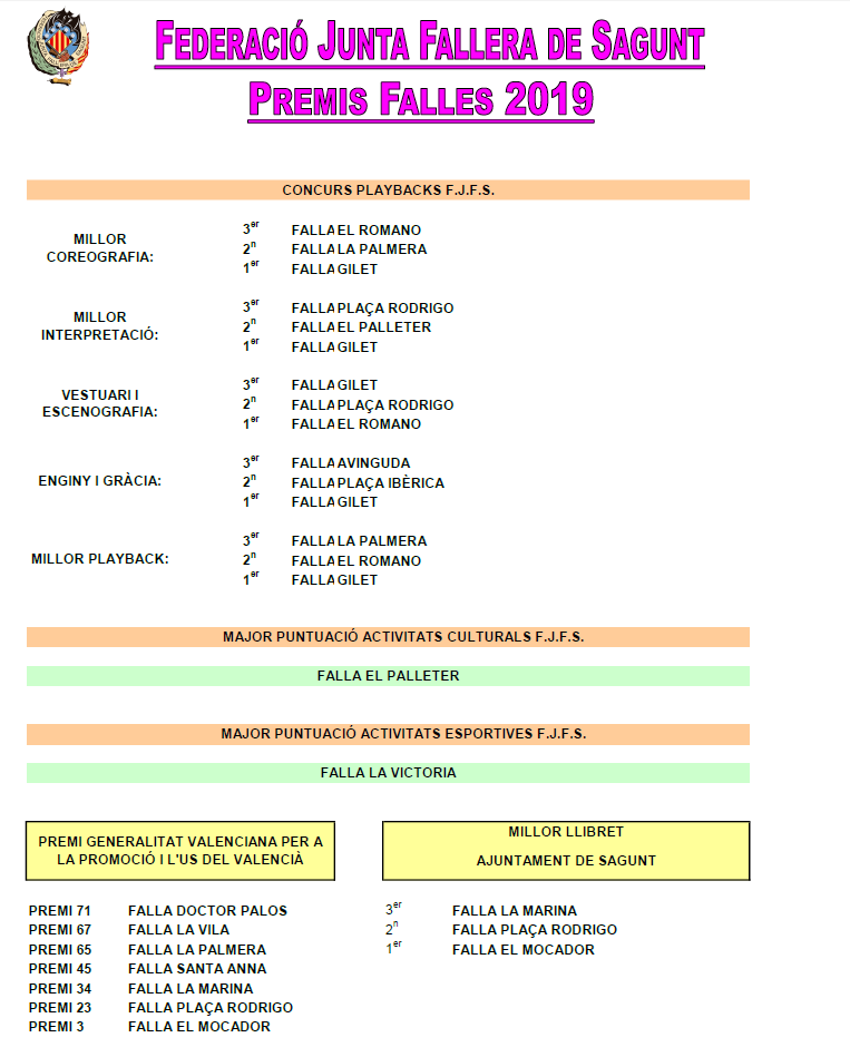 Finalment, la falla El Mocador es va fer amb el premi al millor llibret, atorgat per l'Ajuntament de Sagunt. Les falles Plaça Rodrigo i La Marina són segona i tercera en esta categoria. També cal destacar que la Falla El Mocador ha rebut el tercer premi de la Generalitat Valenciana en la promoció i ús del valencià.​