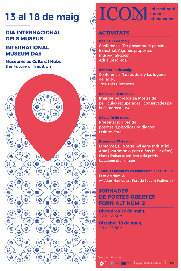 La Fundació de la Comunitat Valenciana de Patrimoni Industrial i Memòria Obrera del Port de Sagunt ha preparat per primera vegada una variada agenda d’activitats per commemorar el Dia Internacional dels Museus, que se celebra tots els anys el 18 de maig. El Forn Alt nº 2 acollirà totes les activitats des del dilluns 13 fins el divendres 17 de maig en horari de vesprada, a partir de les 18.30 hores, i hi estaran obertes a tot el públic de manera gratuïta.