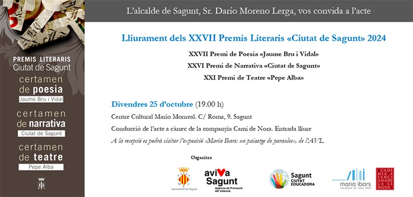 Els premis literaris Ciutat de Sagunt, organitzats pel Gabinet de Promoció del Valencià, arriben enguany a la XXVII edició, una fita cultural dins de l'agenda de la ciutat que cal destacar i celebrar. Els noms de les persones guanyadores d'esta edició, la més nombrosa de la història quant a participació, es coneixeran la vesprada del 25 d'octubre en el transcurs d'un acte cultural molt especial d'entrada lliure en el Centre Cultural Mario Monreal, a les 19 hores, conduït per la companyia Camí de Nora i amb la intervenció d'artistes de disciplines diverses.
