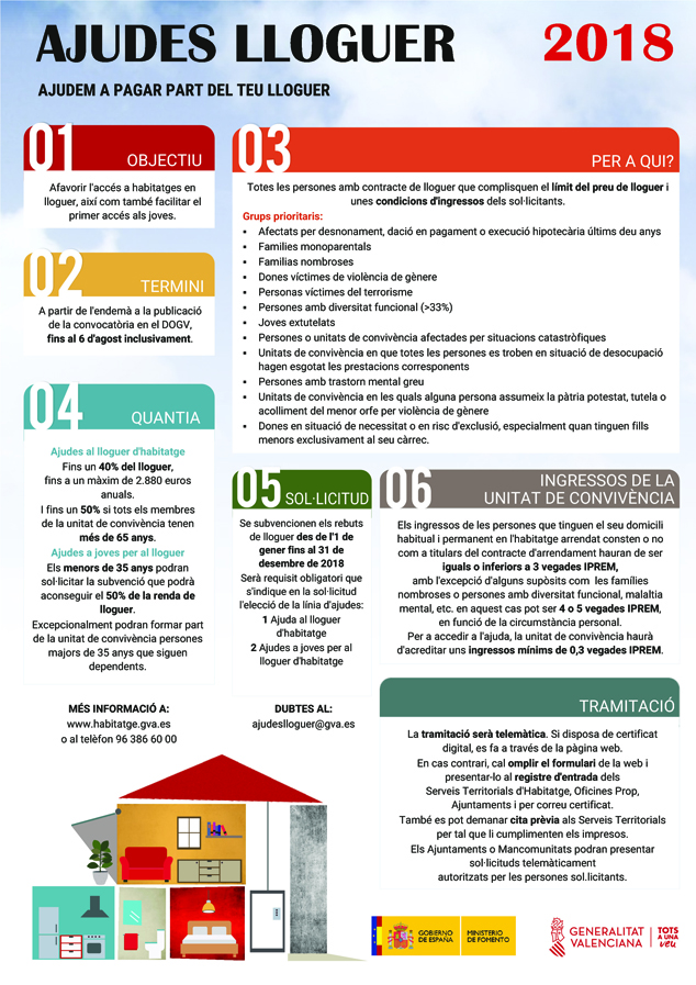 Les ajudes cobrixen fins a un 40% del lloguer amb un màxim de 2.880 euros anuals, i fins a un 50% si tots els membres de la unitat de convivència tenen més de 65 anys. També hi ha ajudes per a jóvens menors de 35 anys, els quals podran sol·licitar una subvenció que podrà cobrir fins al 50% de la renda de lloguer. Excepcionalment s'acceptaran sol·licituds d'unitats de convivència amb persones majors de 35 anys que siguen dependents.