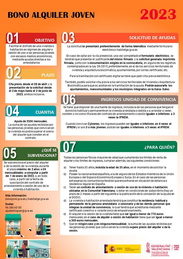 La Generalitat Valenciana ha publicat una notícia amb les ajudes del Bo de Lloguer Jove per a l'edició de 2023-2024, informant que el termini per a presentar sol·licituds serà des del 2 de maig fins al 2 de juny inclòs. A més, el dia 28 d'abril de 2023 s'han publicat en el DOGV les bases reguladores i la convocatòria del Bo de Lloguer Jove per a l'exercici 2023: https://dogv.gva.es/datos/2023/04/28/pdf/2023_4401.pdf.