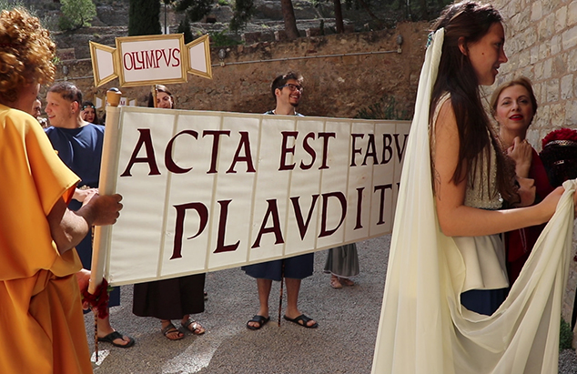 Després del discurs, els praecones van donar entrada al cos sacerdotal romà, que va donar caràcter sagrat a la pompa: flamen, augur, pontifex i Vestal Maxima. Els praecones van presentar els sacerdots i tots van seure en les graderies reservades. A continuació entrà cada taller amb els seus personatges mentre els pregoners explicaven qui eren. La pompa va acabar amb el ball de les dansaires i així es van clausurar els Ludi Saguntini MMXVIII. Finalment, va començar la representació de l'obra Mostellaria, de Plauto.
