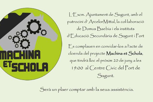 Dimarts que ve 20 de juny, a les 19 hores, el Centre Cívic del Port de Sagunt serà el lloc triat per a la celebració de l'acte de cloenda de la primera fase del projecte educatiu Machina et Schola, dedicat al Circ Romà. Esta iniciativa està organitzada per l'Ajuntament de Sagunt, a través de la regidoria d'Educació, amb el patrocini d’ArcelorMittal i en col·laboració de Domus Baebia i els instituts d'educació secundària del municipi.