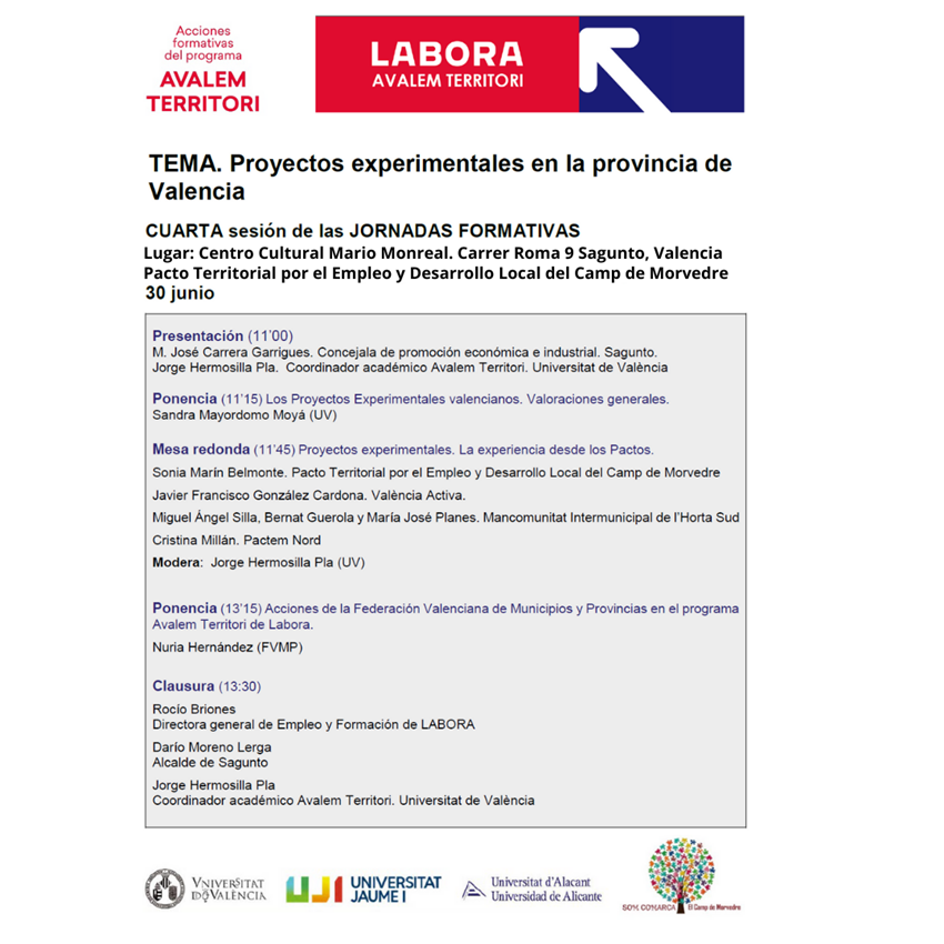 Dijous que ve, 30 de juny, el Centre Cultural Mario Monreal acull la quarta sessió de les jornades formatives que organitza LABORA, dins del Pla Avalem Territori, en col·laboració amb el departament de Promoció Econòmica i Industrial de l'Ajuntament de Sagunt, emmarcada en el Pacte Territorial per l'Ocupació i Desenvolupament Local del Camp de Morvedre. El tema a tractar en esta sessió és ‘Projectes experimentals a la província de València’.