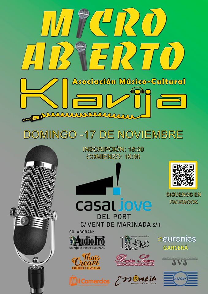 L'Associació Musicocultural Klavija i la delegació de Joventut i Infància de l'Ajuntament de Sagunt organitzen una sessió de micro obert en la sala d'actes del Casal Jove. Un micro obert és un format de xicotetes actuacions (no més de 10 minuts) en el que una o diverses persones exposen el seu art, ja siga música, poesia, teatre, divulgació (tipus ‘xarrada TED’) o qualsevol art escènica d'interés per al públic. S'exigix un mínim de qualitat com a mostra de respecte cap al públic. És una plataforma per donar-se a conéixer o per assaciar les inquietuds d'actuar davant una audiència. Joventut recorda la necessitat de preparar l'actuació amb antelació.