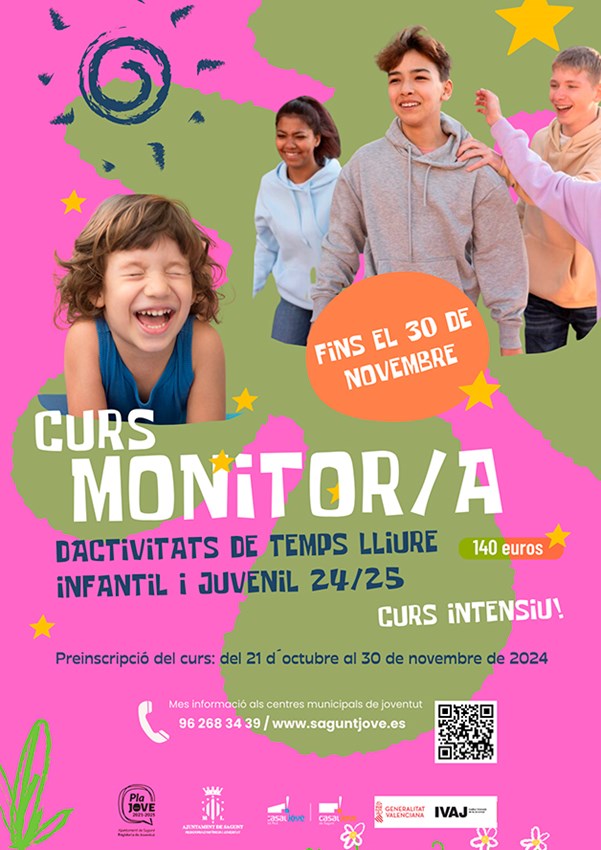 Un any més, el departament de Joventut i Infància de l'Ajuntament de Sagunt oferix un curs d'activitats de temps lliure infantil i juvenil. La matrícula per a esta formació intensiva, orientada a persones jóvens d'entre 18 i 30 anys residents en el municipi, té un preu de 140 euros i una duració de 310 hores (150 lectives i 160 pràctiques).