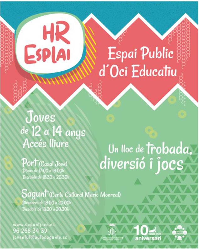La regidoria de Joventut i Infància de l'Ajuntament de Sagunt presenta HR Esplai, Espai Públic d’Oci Educatiu, un nou programa d'oci alternatiu, saludable i gratuït dedicat a jóvens de 12 a 14 anys. Este nou servici és de lliure accés i suposa un lloc de trobada, diversió i jocs no dirigits que estarà atés i dinamitzat per una monitora d'oci i temps lliure.