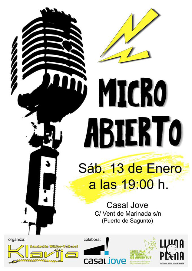 La regidoria de Joventut de l'Ajuntament de Sagunt, junt amb l'Associació Cultural Klavija, ha organitzat una jornada de Micro Obert que tindrà lloc dissabte que ve, 13 de gener, a partir de les 19 hores en el Casal Jove del Port de Sagunt.