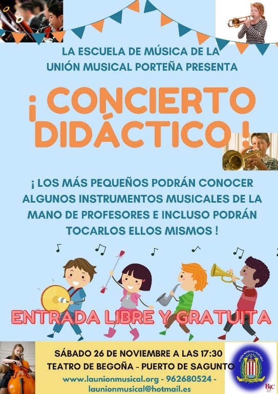 La Unió Musical Porteña a través de la seua escola de música, oferirà este dissabte, 26 de novembre, un concert didàctic infantil gratuït. Serà en el Teatre de Begoña del Port de Sagunt (carrer Progrés, 9) a les 17.30 hores i l'entrada serà lliure fins a completar aforament.