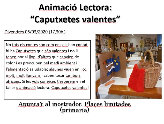 El públic infantil serà protagonista divendres, 6 de març, en els dos contacontes que el departament municipal d’Arxius i Biblioteques ha organitzat en les dos biblioteques municipals. A les 17.30 hores, la Biblioteca Cronista Chabret acollirà Caputxetes Valentes, un taller d’animació lectora on no tots els contes són com ens els han contat, ja que hi ha caputxetes que són valentes i no tenen por al llop. Les hi ha que canvien de color i es preocupen del medi ambient i de l’alimentació saludable i d’altres viuen en llocs molt llunyans i saben tocar tambors africans. A les 18 hores serà en la Biblioteca del Centre Cívic on es presente El cofre de la igualdad, una sessió de contes on s’hi trobaran un cofre ple de contes amb princeses que s’enfronten a dracs en lloc de quedar-se tancades en la torre o que trien elles mateixa el que volen fer amb les seues vides. En acabar este contacontes, que tracta conceptes d’igualtat de gènere explicats amb metàfores per al públic infantil, hi haurà tallers per a xiquetes i xiquets majors de 4 anys. L’aforament dels dos espectacles és limitat, per la qual cosa cal inscriure’s prèviament en cada biblioteca.