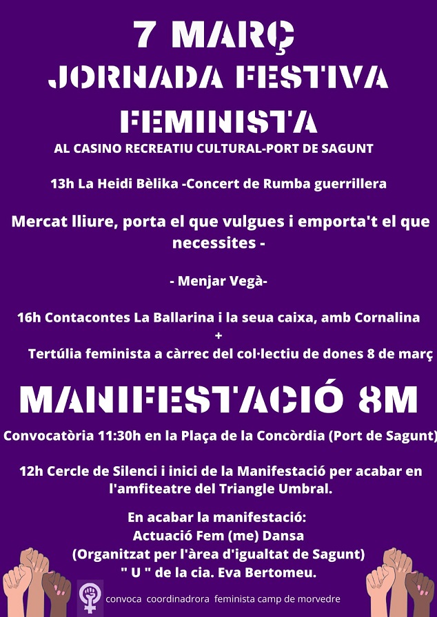 Serà a les 12 hores, quan se celebre la Jornada Festiva Feminista organitzada per Amigas Supervivientes i la Coordinadora Feminista del Camp de Morvedre amb música, tertúlia feminista, zona infantil, etc., en el Casino Recreatiu del Port de Sagunt. A la vesprada, a les 19.30 hores, tindrà lloc el concert Cançons de dona i terra de la cantautora d’Almenara, Eva Gómez, al Teatre de Begonya.