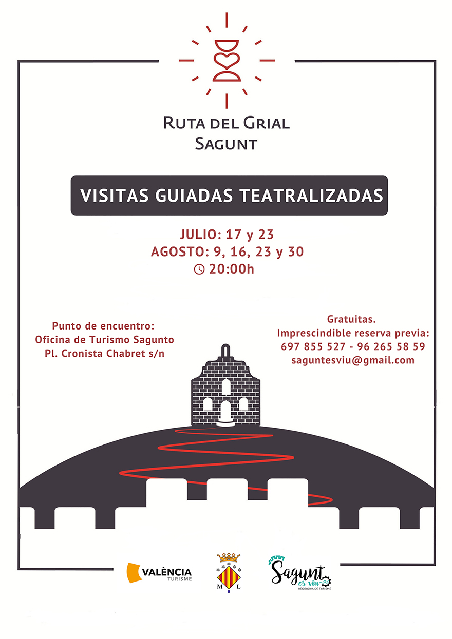 La primera de les propostes serà una visita guiada teatralitzada gratuïta de la Ruta del Greal a Sagunt esta vesprada i que partirà des de l'oficina de Turisme de la plaça Cronista Chabret a les 20 hores. Per poder disfrutar d'esta activitat, que es repetirà el dijous 23 de juliol i el 9, 16, 23 i 30 d'agost, caldrà reservar plaça telefonant al 697 855 527, al 96 265 58 59 o a través del correu electrònic saguntesviu@gmail.com.