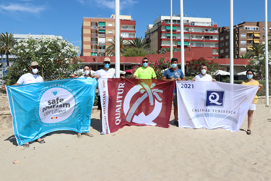 Les banderes Q de Qualitat i Safe Tourism Certified (Turisme Segur Certificat) onegen des d'este dimarts en dues de les platges de Sagunt. L'alcalde, Darío Moreno; el regidor delegat de Platges, Roberto Rovira; la regidora delegada de Turisme, Natalia Antonino; el regidor delegat d'Activitat Física, Salut i Esport, Javier Timón; i el tinent d'alcalde d'Almardà, Pepe Gil, han participat en les platges d'Almardà i Port de Sagunt en els dos actes d'hissat d'estos estendards que acrediten, un any més, al municipi com a garant de la qualitat en el seu litoral.