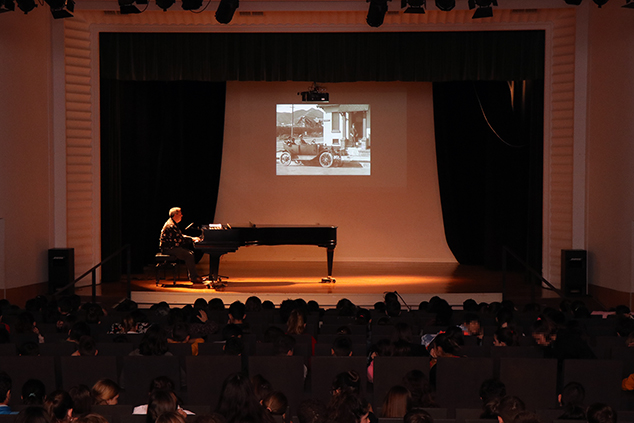Alumnat dels CEIP Tierno Galván, Cervantes, La Pinaeta, Vilamar i Begonya disfrutaren ahir dimarts, 3 de març, en el Teatre de Begonya d’un viatge musical i visual a les primeres projeccions dels germans Lumière, Méliès i el cinema còmic de Chaplin en una nova edició de les audicions escolars d’Educamúsica on rememoraren la figura del pianista en les sales de projecció del cinema mut de la mà del pianista Jorge Gil Zulueta.
