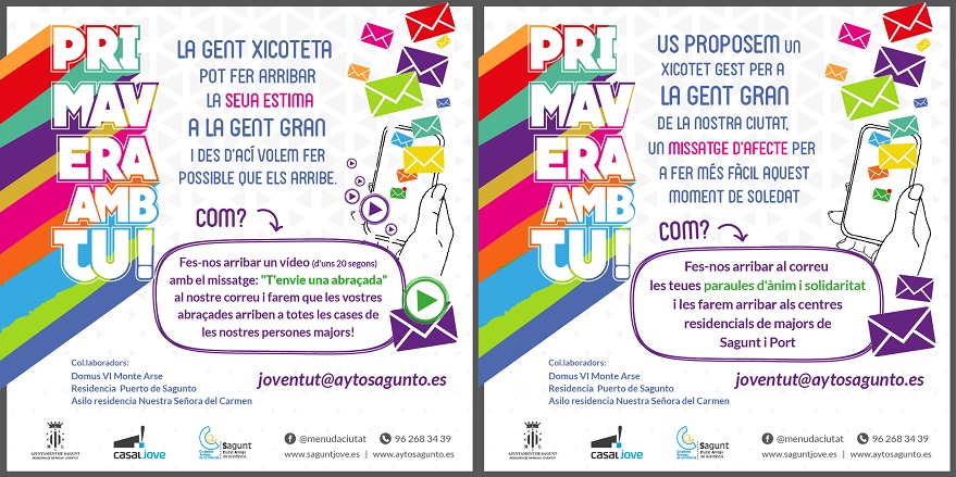 La Regidoria de Joventut i Infància de l'Ajuntament de Sagunt, amb la col·laboració de Domus VI Monte Arse, la Residencia Puerto de Sagunto i el Asilo Residencia Nuestra Señora del Carmen, desitgen acostar la població jove i menor de la ciutat a les persones majors a través de missatges d'afecte i solidaritat per a fer més fàcils estos moments de soledat que viu este grup de ciutadans i ciutadanes per la crisi del coronavirus.