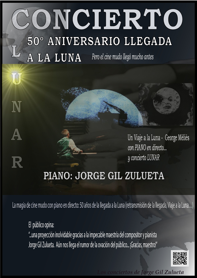 El compositor i pianista Jorge Gil Zulueta oferirà este 7 de desembre, a les 19.30 h, en el Centre Cultural Mario Monreal el concert de piano, Un viatge a la lluna, amb motiu del 50 aniversari de l’arribada de l’home a la Lluna. El músic català interpretarà obres conegudes com Així va parlar Zarathustra, de Richard Strauss; Space Odity, de David Bowie; Moonlight Serenade, de Glenn Miller; Moonriver, d'Henry Mancini; Moonshadow, de Cat Stevens; Moondance, de Van Morrison, entre d’altres. Durant la interpretació es projectaran fragments de les pel·lícules La Dona en la Lluna de Fritz Lang i El viatge a la Lluna de George Méliès.