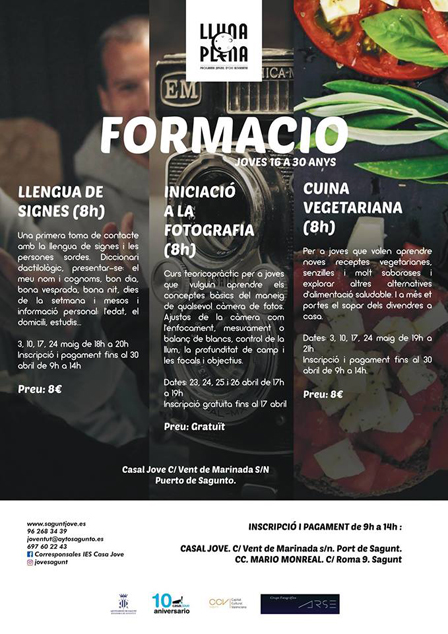 La regidoria de Joventut de l'Ajuntament de Sagunt té previst ampliar i diversificar el programa d'oci alternatiu per a adolescents, Lluna Plena, a partir de finals d'abril i durant tot maig. Amb este objectiu, i amb la intenció d'oferir un oci que compagine formació i diversió, naix ‘Lluna Plena Formació’, amb tres cursos dirigits als jóvens de 16 a 30 anys, en horari de vesprada. De moment, i de manera experimental, es posen en marxa tres dels tallers que han sol·licitat els mateixos adolescents en funció dels seus interessos, Fotografia, Cuina Vegetariana i Llengua de Signes, però la idea, tal com explica el regidor de Joventut, Guillermo Sampedro, “és ampliar a més tallers i cursos si este experiment funciona”.