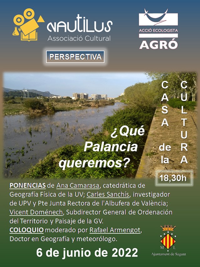 En esta ocasió, l'Associació Cultural Nautilus col·labora amb Acció Ecologista Agró-Morvedre per a presentar un acte multidisciplinari conduït per Rafael Armengot, doctor en Geografia i meteoròleg, que començarà amb la projecció de l'audiovisual El riu Palància al Camp de Morvedre, realitzat per Carlos González Torres, i a continuació es desenvoluparan les tres ponències a càrrec de personalitats molt rellevants i especialistes en este tema: Ana Camarasa Belmonte, catedràtica de Geografia Física de la Universitat de València, davall el títol Quin riu tenim?; Carles Sanchis Ibor, investigador de la Universitat Politècnica de València i president de la Junta Rectora de l'Albufera de València, que abordarà la Gestió de l'aigua i els sediments; i, finalment, Vicent Doménech Gregori, subdirector general d'Ordenació del Territori i Paisatge de la Generalitat Valenciana, la intervenció del qual versarà sobre La gestió de les riberes.