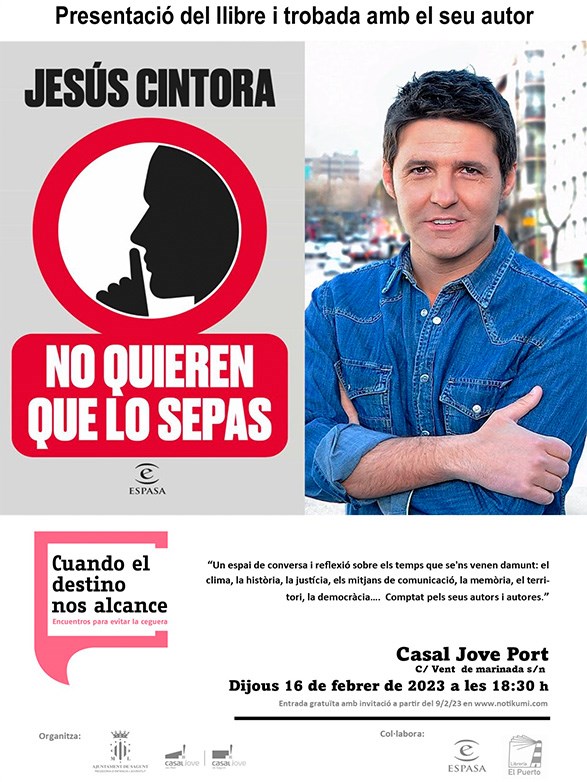 Davall el títol ‘Cuando el destino nos alcance: encuentros para evitar la ceguera’, el departament de Joventut i Infància de l'Ajuntament de Sagunt, dona continuïtat al projecte de trobada amb pensadors i escriptors amb la idea d'obrir un debat sobre diferents qüestions que ens afecten o afectaran en un futur. Per exemple què fer amb el canvi climàtic, el territori, la comunitat, la manera d'organitzar-nos, la importància de la memòria i la història per a encarar el futur, el periodisme etc. En esta quarta cita el protagonisme és per al món del periodisme i serà Jesús Cintora qui presentarà el seu assaig No quieren que lo sepas.