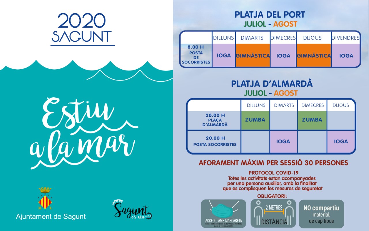 L'Ajuntament de Sagunt presenta la nova edició d’Estiu a la mar, una sèrie d'activitats esportives gratuïtes que tindran lloc a la platja del Port de Sagunt i a la platja d’Almardà. El programa comença hui i finalitzarà el pròxim 31 d'agost. Les activitats estan organitzades per l'àrea d'Activitat Física i Salut del departament d'Esports.