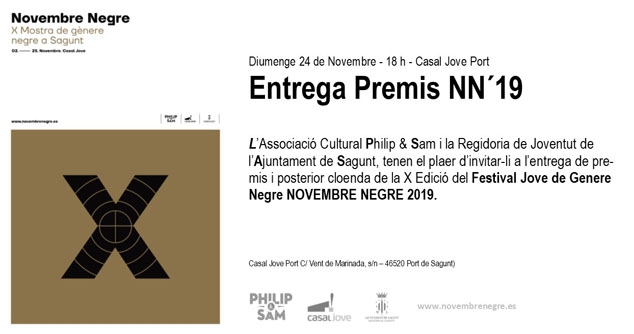 La ‘X Mostra de gènere negre a Sagunt Novembre Negre’ arriba a la recta final. El festival organitzat per la regidoria de Joventut i Infància de l'Ajuntament de Sagunt i l’Associació Cultural Philip & Sam celebrarà diumenge que ve 24 de novembre, a les 18.00 hores, la Gala de Lliurament de Premis en el Casal Jove del Port de Sagunt.
