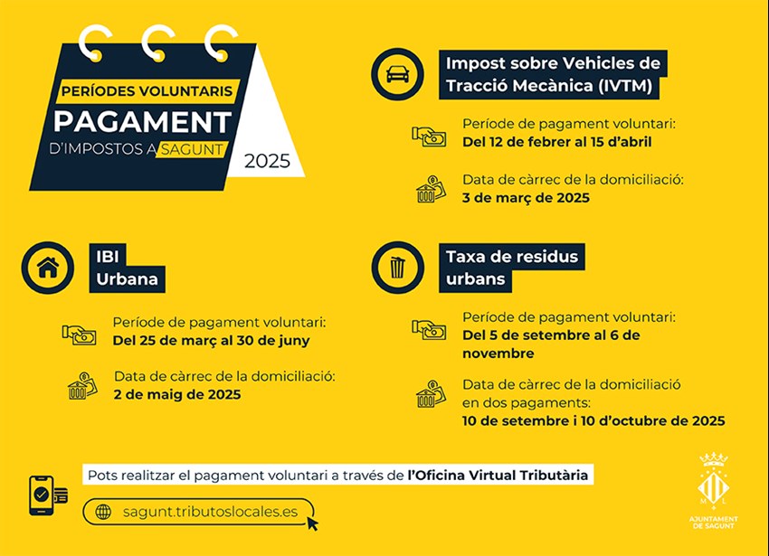 La informació completa amb el calendari de pagaments detallat i les instruccions per a formalitzar l'abonament dels mateixos es pot trobar en el Calendari Fiscal del Contribuent 2025 publicat en la pàgina web institucional de l'Ajuntament de Sagunt.