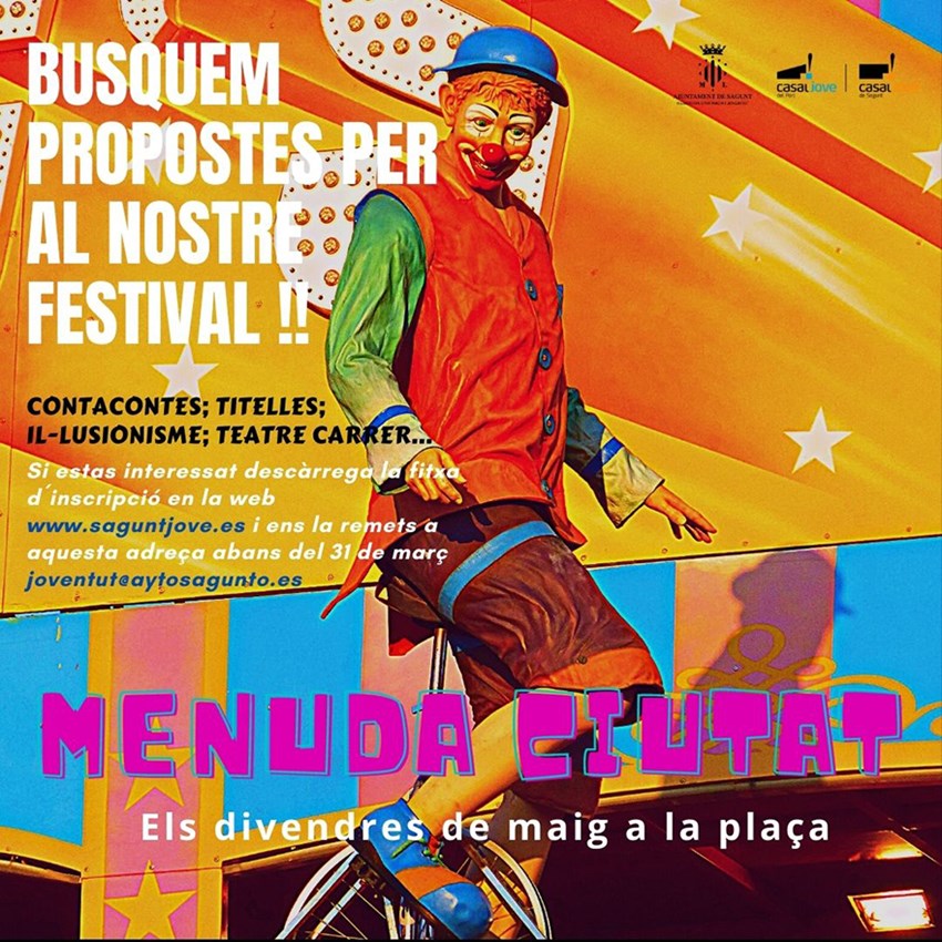 La Regidoria de Joventut i Infància de l'Ajuntament de Sagunt torna a organitzar el programa Menuda Ciutat: Els divendres a la plaça, un mini festival escènic per a la població més xicoteta amb contacontes, titelles, il·lusionistes, teatre al carrer, màgia, circ i tot tipus d'entreteniment que se celebrarà al maig d'este 2022. Amb la finalitat d'elaborar la programació del mateix, s'ha obert el termini de presentació de propostes escèniques fins al 31 de març.