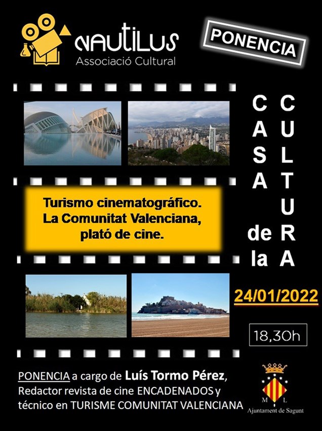 L'Associació Cultural Nautilus, en col·laboració amb el Departament de Cultura de l'Ajuntament de Sagunt, organitzen este dilluns, 24 de gener, la ponència Turisme cinematogràfic. La Comunitat Valenciana, plató de cinema, a càrrec de Luis Tormo Pérez, crític de cinema i tècnic de Turisme Comunitat Valenciana.