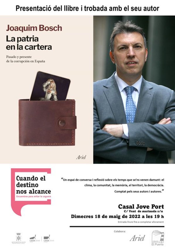 El jutge Joaquim Bosch serà el protagonista de la segona cita del cicle Quan el destí ens alcance: trobades per a evitar la ceguesa, que organitza el Departament de Joventut i Infància de l'Ajuntament de Sagunt, en què el magistrat del Jutjat de Primera Instància i Instrucció Núm. 1 de Montcada presentarà el seu últim llibre: La patria en la cartera. Pasado y presente de la corrupción en España.