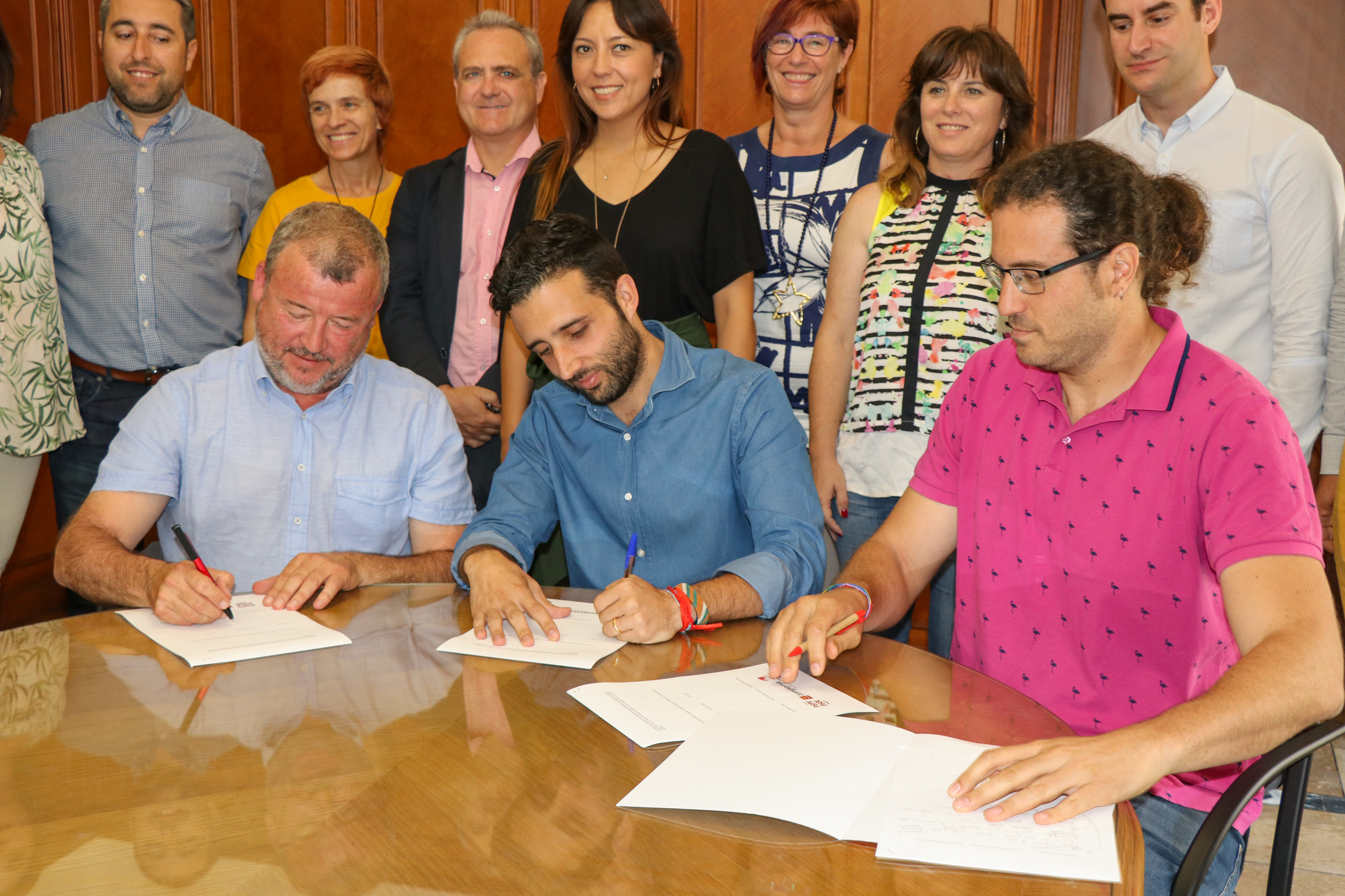 Este matí s'ha signat el pacte que dóna majoria absoluta al nou equip de govern de l'Ajuntament de Sagunt, format per PSPV-PSOE, Compromís i Esquerra Unida amb l'alcalde socialista Darío Moreno al capdavant. El pacte, denominat ‘Pacte de la Gerència’ s'ha signat este matí en este emblemàtic edifici, un gest que pretén demostrar la importància que se li pretén donar al patrimoni en esta legislatura. En total seran 14 regidors i regidores els que formen el govern dels pròxims quatre anys.