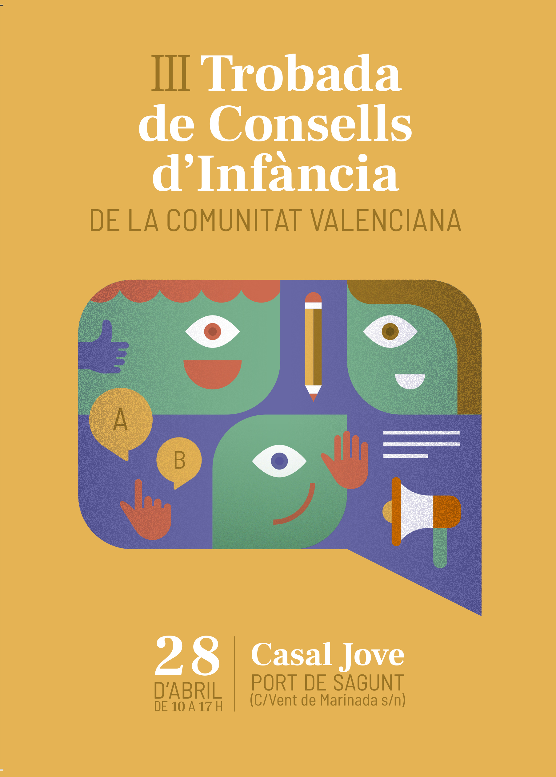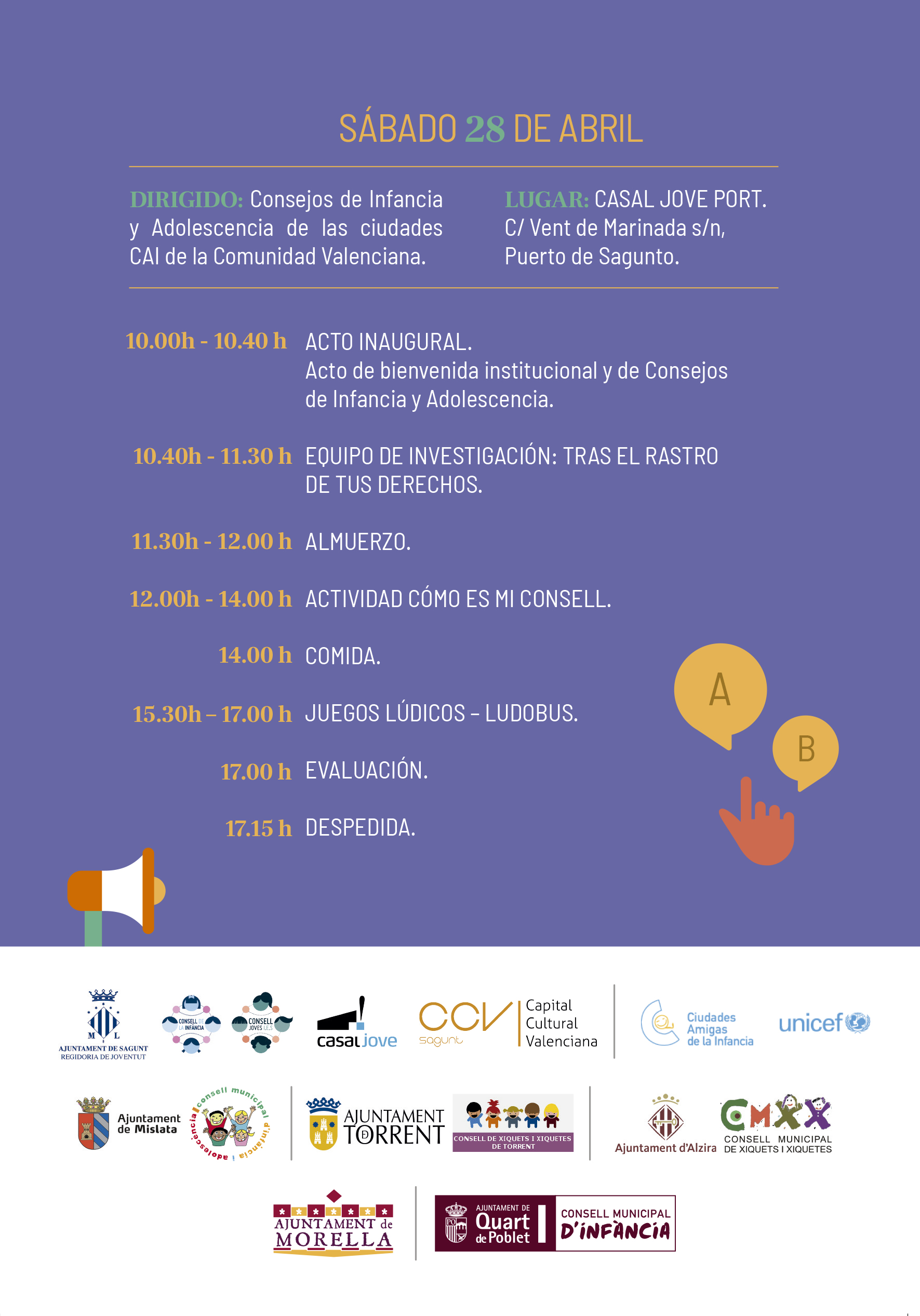 El Casal Jove del Port de Sagunt acull dissabte que ve, 28 d’abril, la III Trobada de Consells d’Infància de la Comunitat Valenciana, una trobada dels consells d’infància i adolescència d’aquells municipis que tenen reconegut el segell de Ciutat Amiga de la Infància atorgat per UNICEF. El segell s’entrega a aquells municipis per la seua excel·lència i bones practiques en materia de polítiques d’infància, entre ells Sagunt, que ja compta amb el segell CAI des de fa dos anys. Els municipis que participen en la trobada són Mislata i Torrent, que acolliren la primera i segona trobada respectivament, i Quart de Poblet, Alzira, a més de Sagunt, que, en este cas ho fa a més com amfitriò.