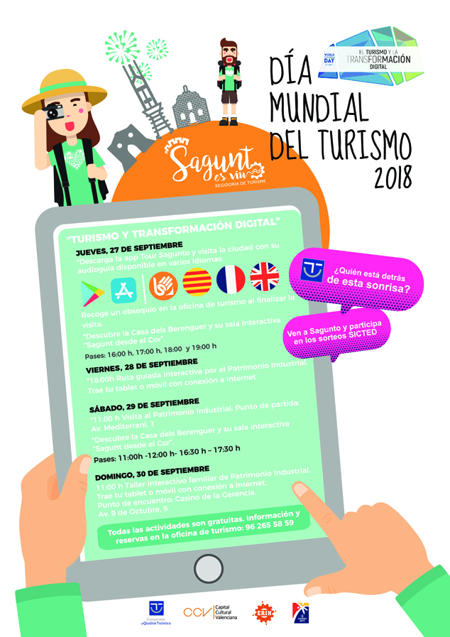 Sagunt s'unix a la celebració del Dia Mundial del Turisme -DMT- 2018. Encara que este dia se celebra el dijous 27 de setembre, la delegació de Turisme de l'Ajuntament de Sagunt ha organitzat activitats que es perllongaran durant tot el cap de setmana. Sota el lema ‘El turisme i la transformació digital’, l'objectiu d'estes jornades és donar visibilitat a les idees innovadores capaces de revolucionar la forma en què viatgem i gaudim del turisme.