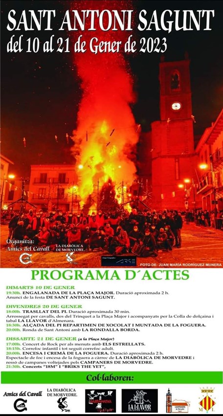 Des de l’Associació Diabòlica de Morvedre han explicat en què consistiran els actes i han destacat que  «estan molt contents i contentes de de tornar a la normalitat i que han fet una programació tenint molt en compte als menuts». Així doncs, el dissabte, 21 de gener, a les 17 hores, hi haurà un concert de rock per als més menuts de la mà del grup Els Estrellats. Posteriorment, a les 18.15 hores tindrà lloc un correfoc infantil que discorrerà des de Camí Reial i que comptarà amb la Colla Jove del Ball de Diables de l'Hospitalet de l'Infant i la Diaboliqueta de Morvedre. A les 19 hores començarà el correfoc adult des de la plaça Major amb les colles de Diables El Peirot de Tremp, la Colla Vella del Ball de Diables de l'Hospitalet de l'Infant, Diables de Castelló, Dimonis Socarrats de Campanar i la Diabòlica de Morvedre. A les 20 hores serà l'esperada encesa de la foguera i el toc de campanes voltejades pels Campaners de Morvedre. Finalment, a les 21.30 hores la clausura arribarà amb el concert de 18M i Briks the Yet. Totes estes activitats estan organitzades per l'Associació Diabòlica de Morvedre i l’Associació Amics del Cavall en col·laboració amb el departament de Festes de l'Ajuntament de Sagunt i altres associacions.