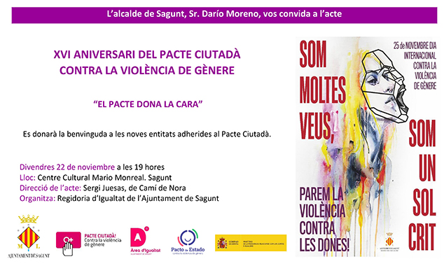 L'Ajuntament de Sagunt, des de la seua Àrea d'Igualtat, convoca la ciutadania a la commemoració del 16é Pacte Ciutadà contra la Violència de Gènere. L'acte tindrà lloc divendres que ve 22 de novembre, a partir de les 19.00 hores, en el Centre Cultural Mario Monreal de Sagunt.