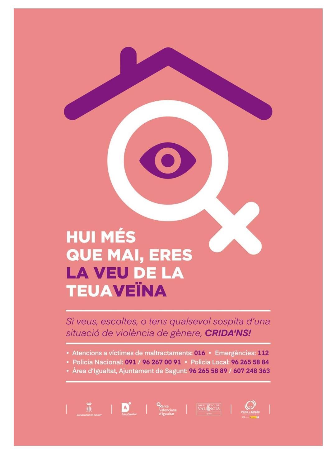 Així mateix, el departament recorda que el servici d'atenció a les dones, en l'Àrea d'Igualtat, es realitza de manera presencial els dimarts, dijous i divendres, amb cita prèvia a través del número 96 265 58 89 (de 8 a 15 hores), del WhatsApp 607248363 (de 8 a 19.30 hores) o bé via telemàtica en dona@aytosagunto.es.